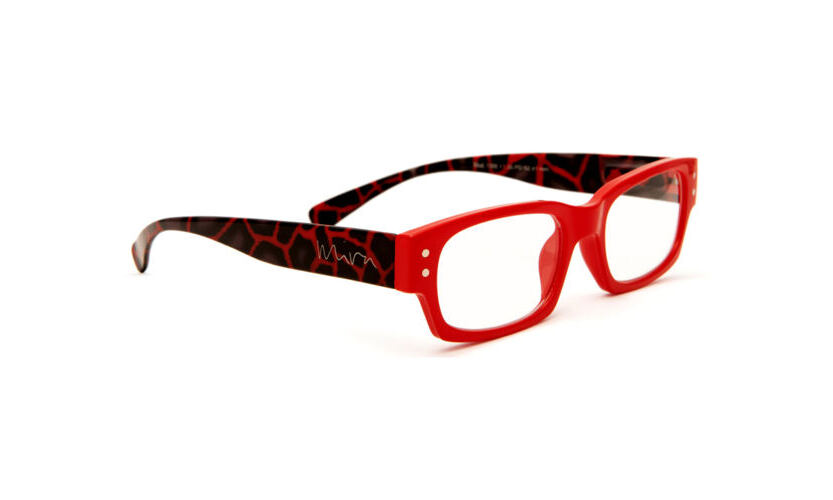Rote Lesebrille mit dezentem "Leopardenmuster" auf dem Bügel.