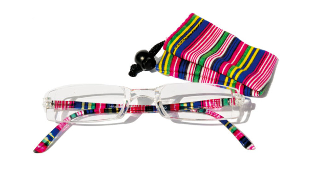 - Einstück-Acrylglaslesebrille mit modischen, farbig gemusterten Bügeln und passendem Stoffetui.