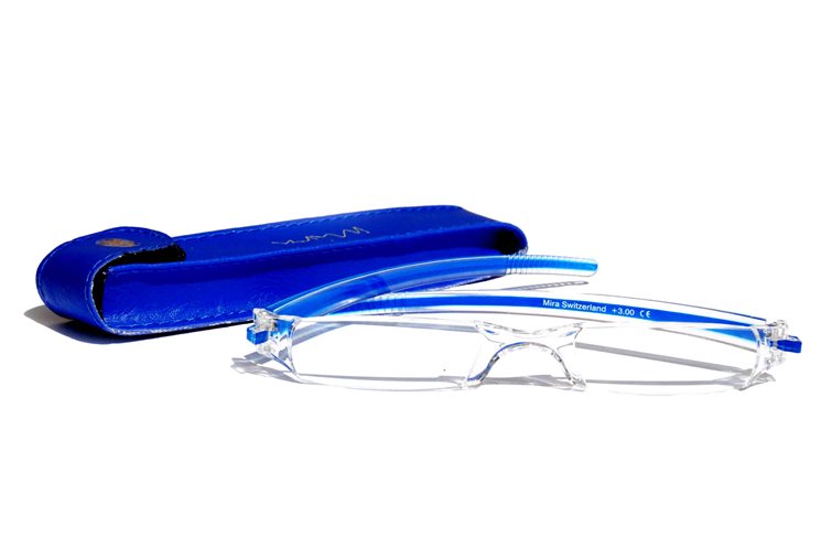 Modische Einstück-Acrylglaslesebrille in frischen Farben mit passendem Etui.